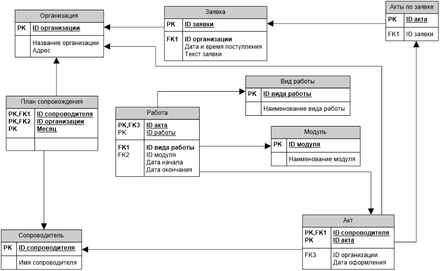 1. В результате изучения предметной области были выделены основные сущности, такие как Организация, Заявка, План сопровождения, Работа, Вид работы, Модуль, Сопроводитель, Акт, Акт по заявке, связи между ними и атрибуты сущностей, которые затем подверглись документированию.