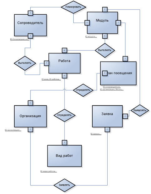 | 6 | Связи | Работа может подразделяться на несколько видов, работа может выполняться на определенном модуле, по окончании работы оформляется акт. |