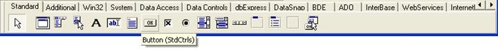 Палитра компонент использует постраничную группировку объектов. Вверху палитры находится набор закладок - Standard, Additional, Dialogs и т.д. Для выбора страницы палитры компонентов используются стрелки перемещения, расположенные в правом верхнем углу.