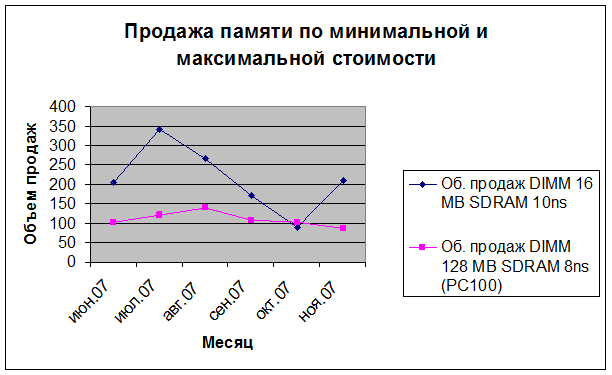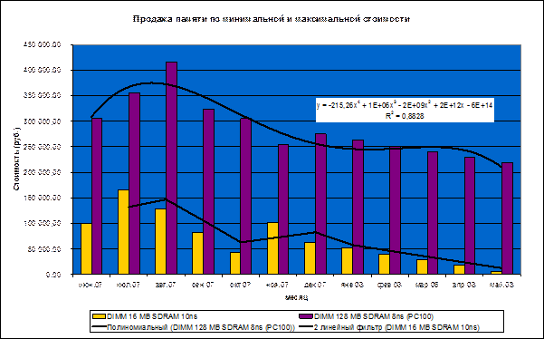 Закон изменения стоимости оборудования DIMM 128 MBSDRAM 8ns (PC100) – полимерный, а DIMM 16 MBSDRAM 10ns – скользящее среднее (2 линейный фильтр). Коэффициент аппроксимации R2 близок к единице, что указывает на высокую степень достоверности выбранного закона.