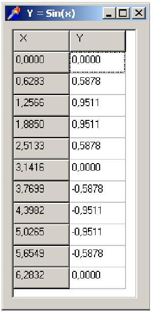 Приведем пример простой программы заполнения таблицы. Как и для демонстрации графических возможностей, обратимся к простой функции sin x и “затабулируем” ее на отрезке, равном периоду. Договоримся для простоты разбить отрезок на 10 равных частей.