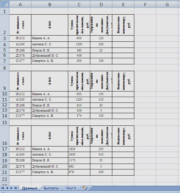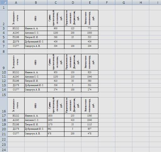 5. Заполнить таблицы «Свод лицевых счетов пенсионеров» по месяцам исходными данными (рис.2.1).