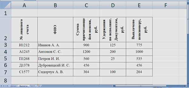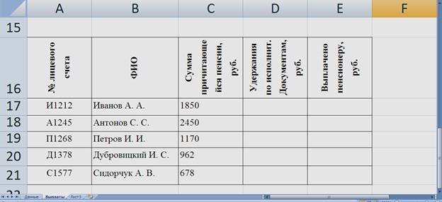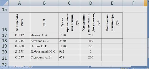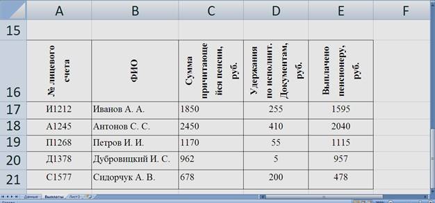 | № лицевого счета | ФИО | Сумма причитающейся пенсии, руб. | Удержания по исполнит. Документам, руб. | Выплачено пенсионеру, руб. |