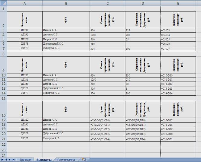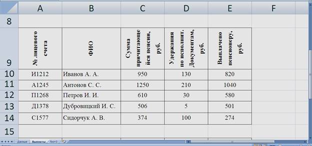 9. Заполнить графу Выплачено пенсионеру таблицы «Свод лицевых счетов пенсионеров» за январь 2006 г. , находящейся на листе Выплаты (предварительно скопированную с листа Данные ) следующим образом:
