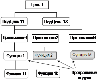 Метод предполагает последовательное разложение функции обработки данных на простые функциональные элементы ("сверху вниз"). В результате строится функциональная структура алгоритма (ФСА) приложения, в которой отражаются: · цели предметной области (цель-подцель ); · состав приложений (задач обработки ), обеспечивающих реализацию поставленных целей; · характер взаимосвязи приложений с их основными характеристиками; · функции обработки данных; Функциональная структура приложения. . . . . . . . . . . . . . По частоте использования функции делятся на: · однократно выполняемые; · повторяющиеся. |