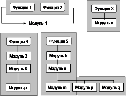 Модуль представляет собой совокупность логически связанных элементов, предназначенных для использования другими модулями и программами. Модули предназначены для хранения готовых программ. Модуль сам по себе не является выполняемой программой – его объекты используются другими программными единицами (процедурами, функциями). Модуль имеет: · один вход и один выход – на входе программный модуль получает определенный набор исходных данных, выполняет обработку данных и возвращает один набор результатных данных, т.е. реализует принцип IPO (Input – Process – Output) – вход-процесс-выход; · функциональную завершенность – модуль выполняет перечень операций для реализации каждой отдельной функции в полном составе, достаточных для завершения начатой обработки; · логическую независимость – результат работы модуля зависит только от исходных данных, и не зависит от работы других модулей; · слабые информационные связи с другими программ- ными модулями – обмен информации между модулями должен быть по возможности минимизирован; · обозримый по размеру и сложности программный элемент. Каждый модуль состоит из: Спецификации – правила использования модуля и Тела – способ реализации процесса обработки. Модульная структура приложения. Принцип модульного программирования ПП: 1. определение состава и подчиненность функций, 2. определение набора программных модулей, реализующих эти функции. При составлении алгоритма необходимо учитывать: · Каждый модуль вызывается на выполнение вышестоящим модулем и, закончив работу, возвращает управление вызвавшему его модулю; · Принятие основных решений в алгоритме выносится на максимально «высокий» по иерархии уровень; · Для использования одной и той же функции в разных местах алгоритма создается один модуль, который вызывается на выполнение по мере необходимости. Функционально-модульная схема (ФМС). Функция 1 и Функция 2 выполняются с помощью одного и того же программного Модуля. Функция 3 реализуется одним программным модулем. Функция 4 – в виде последовательности выполнения Программных Модулей (2, 3 . . . p). Функция 5 – с помощью иерархии связанных модулей. Алгоритмы большой сложности представляются с помощью схем двух видов: · Обобщенной схемы алгоритма – раскрывает общий принцип функционирования алгоритма и основные логические связи между отдельными модулями: · Детальной схемы алгоритма – представляет содер- жание каждого элемента обобщенной схемы с ис- пользованием управляющих структур в блок-схемах и алгоритмических языков высокого уровня. |