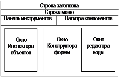 Главное окно содержит: - Строку заголовка , которая отображает имя открытого проекта; - Строку меню с набором команд для разработки, тестирования приложений и управления ими; - Панель инструментов включает 15 кнопок, соответствующих основным командам меню; - Палитра компонентов отображает компоненты, с помощью которых создается приложение. Группы компонентов размещаются на 19 вкладках. В Delphi используется открытая компонентная архитектура, которая позволяет добавлять компоненты. Компоненты подразделяются на: – Визуальные (кнопки, поля редактирования), – Логические (таблицы, отчеты) компоненты. 5 панелей инструментов: – Стандартная, – Просмотр, – Отладка, – Пользователь, – Рабочий стол. |