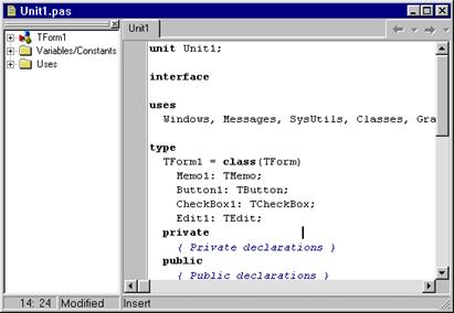 Первоначально имеет заголовок Unit1.pas. Окно редактора содержит исходный текст модуля разработки. Редактор и форма тесно связаны между собой (переключаться между ними можно клавишей F12). В Окне Проводника кода отображаются объекты модуля формы, что позволяет быстро обращаться к объектам и создавать новые классы. Окна в Delphi могут стыковаться друг с другом с помощью мыши, сливаться в одно общее окно, разделенное на несколько частей. |