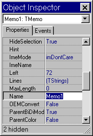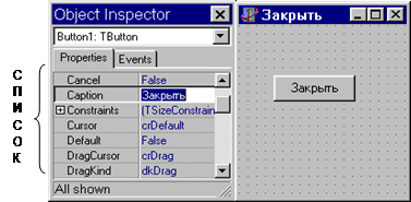 Страница Свойство (список свойств) отображает информацию о текущем компоненте. Страница События (список событий) определяет процедуру, которую компонент должен выполнить при возникновении указанного события. |