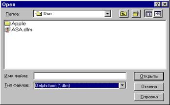 описания UNIT.DFM и файл модуля UNIT.PAS. Файл описания формы (*.dfm) содержит характеристики формы и ее компонентов (двоичный). При конструировании формы в Файл описания автоматически вносятся соответствующие изменения. Для каждой формы декларируется тип, определяющий эту форму как класс. Он содержится в модуле UNIT1.PAS Чтобы отобразить этот файл на экране необходимо: 1. Закрыть окно Конструктора той формы, для которой нужно отобразить файл описания; 2. Активизировать команду File/Open (Файл/Открыть); 3. В диалоговом окне ( ДО ) Open (Открыть) в списке типов файлов найти и установить маску *.dfm; 4. Выделить нужный файл и нажать на кнопку Open. Редактор кода и его содержимое будет доступно для просмотра и редактирования. Чтобы открыть окно Конструктора формы: 1. Закрывается Редактор кода командой File/Close ; 2. Открывается Конструктор формы командой View/ Forms, в ДО которого выбирается нужная форма. Файл модуля формы (*.pas) содержит описание класса формы (поведение компонент и функционирование обработчиков событий). Создается автоматически при добавлении новой формы. При размещении на форме компонентов, в модуль формы вносятся соответствующие изменения. Часть изменений вносит Delphi, а часть – разработчик. Открыть модуль формы можно с помощью: - команды File/Open или - в ДО View/Units (Просмотр/Модули), где выбирается нужный модуль. Файлы Модуля формы и Описания формы имеют одинаковое имя , которое отличается от имени файла проекта . |