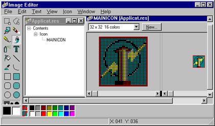 Эти компоненты являются ресурсами Windows, поскольку они разработаны в соответствии со стандартами этой системы. На рисунке показано окно редактора, в которое загружен файл и выполняется редактирование пиктограммы приложения. Файл ресурсов имеет иерархическую структуру, в которой ресурсы разбиты на группы, а каждый ресурс имеет уникальное в пределах группы имя. Имя ресурса задается при его создании и в последующем используется в приложении для доступа к этому ресурсу. Программа проекта находится в группе Icon и по умолчанию имеет имя MAINICON. |