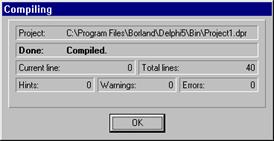 Компиляция может быть выполнена на любой стадии разработки проекта. При компиляции происходит: - создание исполняемого файла - приложения *.EXE; - компиляция файлов всех модулей, содержимое которых изменилось после последней компиляции. В результате создается файл с расширением *.DCU; - перекомпиляция модуля, в который внесены изменения и модулей, использующие его с помощью директивы uses. Ход процесса компилирования будет отображаться на экране, если установить опцию Show compiler progress в меню Tools/ Environment Options/ Preferences. Сборка проекта выполняется командой Project /Bild <Project 1> . При сборке перекомпилируются все модули, входящие в проект, не зависимо от того, были в них внесены изменения или нет. Запускать проект можно из: - среды Delphi и - среды Windows. Запуск проекта из среды Delphi выполняется командой Run/Run. Созданное приложение начинает свою работу. При внесении изменений в файлы, предварительно выполняется компиляция проекта. Особенности запуска в среде Delphi: - нельзя запустить вторую копию приложения; - продолжить разработку проекта можно только после завершения работы приложения; - при "зависании" приложения завершение его работы необходимо выполнить средствами Delphi командой Run/Program Reset или клавишами <Ctrl>+<F2>. Запуск проекта из среды Windows запускается так же, как и любое другое приложение, например с помощью Проводника. Для отладки приложений в среде Delphi можно использовать отладчик . |