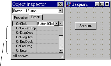 Реакция окна на разного рода действия пользователя определяет функциональность приложения. Обработчики событий компонента – какое действие можно поручить выделенному компоненту. Каждый компонент имеет стандартный обработчик события. Чтобы при нажатии на кнопке "Закрыть" кнопка реагировала на событие закрыть, необходимо создать или указать процедуру обработки события, которая будет вызываться при возникновении данного события. Для создания процедуры обработки события нужно: 1) выделить на форме компонент; 2) перейти на страницу событий Инспектора Объектов; 3) создать обработчик события OnClick. Для этого: - сделать двойной щелчок в области значения события OnClick, ( Delphi автоматически создаст в модуле формы заготовку процедуры-обработчика). - в месте, где установится курсор написать код, который будет выполняться при нажатии кнопки Button1. - набрать строку Form1.Close ; Все остальное Delphi создаетавтоматически. При изменении имени кнопки с помощью Инспектора Объектов происходит автоматически переименование этой процедуры во всех файлах (DFM и PAS) проекта. Для удаления процедуры-обработчика достаточно удалить код, который программист вносил в нее самостоятельно. После этого при сохранении или компиляции модуля обработчик будет удален автоматически из всех файлов проекта. Процедура, связанная с несколькими событиями для различных компонент называется общим обработчиком и вызывается при возникновении любого из связанных с ней событий. |