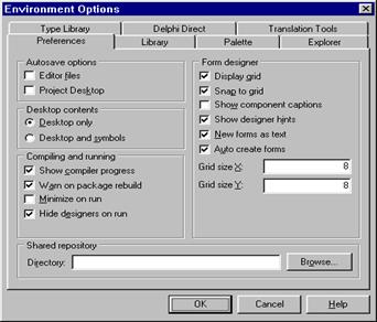 по командеTools/Environment Options (Средства / Параметры среды). Возможны следующие настройки: - параметров конфигурации Deldhi, - задание рабочих папок компилятора и компоновщика для всех файлов проекта, - страниц и компонентов на Палитре компонентов, - шрифта и цвета Редактора кода, - автосохранение редактируемых файлов Все параметры объединены по группам, размещенным на отдельных страницах. |