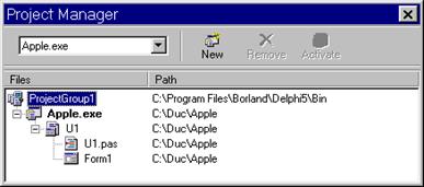 Менеджер Проекта позволяет объединять проекты которые работают вместе в одну проектную группу. Это позволяет организовать как работу взаимозависимых проектов, таких как однозначные и многозадачные приложения или DLL, так и совместную работу исполняемых программ. На рис. Показано окно Project Manager с открытым проектом Apple. В списке окна можно открыть какой-либо модуль для просмотра или редактирования двойным щелчком мыши по его имени или командой Open контекстного меню этого файла. |