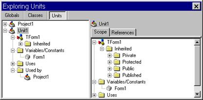 С помощью обозревателя проекта можно перебирать используемые программой модули и просматривать символы в разделах interface или implementation; можно перебирать глобальные символы приложения, просматривать их объявления и переходить к ссылкам на них в исходном коде. Окно обозревателя проекта разделено на две части. Слева в иерархическом виде отображаются доступные для выбранной страницы объекты, а справа для выбранного объекта более детально отображаются его характеристики. В зависимости от выбранного типа просматриваемого объекта в правой части могут быть доступны следующие варианты детального просмотра характеристик: Scope, Inheritance, References Можно отображать или скрывать соответствующие объекты, например переменные или константы модуля. |