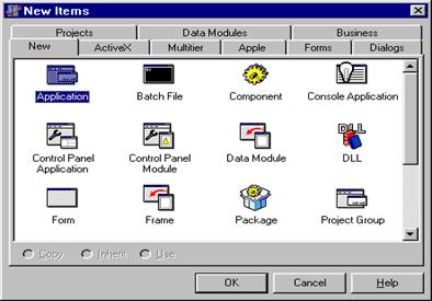 Эти объекты находятся в хранилище (Repository). Их можно просмотреть в окне New Items (Новые элементы), вызвав командой File/New… В хранилище находятся шаблоны приложений, форм, отчетов, Мастера форм. Объекты добавляются различными способами: - Copy – в проект добавляется копия из хранилища. Все изменения в объекте являются локальными и не затрагивают оригинал; - Inherit – от объекта из хранилища порождается (наследуется) новый объект и добавляется к проекту. Все модификации с объектом в проекте нельзя удалить. - Use – в проект включается непосредственно сам объект из хранилища со всеми файлами. При изменении в проекте этого объекта изменяется и объект в хранилище. |