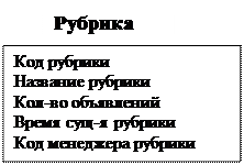 Код рубрики {Название рубрики, Кол-во объявлений, Время сущ-я рубрики, Код менеджера рубрики}