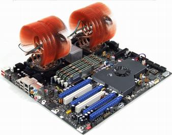 Наконец, последний вариант для сумасшедшего разгона - новая система водяного охлаждения Gigabyte 3D Galaxy II. Вентилятор на водяной головке охлаждения поначалу кажется лишним, но он всё же помогает охлаждать стабилизаторы напряжения, окружающие сокет CPU. Все современные процессоры Core 2 Duo используют 1066-МГц шину FSB (266 МГц с технологией QDR), а многие материнские платы, включая топовые, не способны выдать частоту FSB выше 300 МГц.