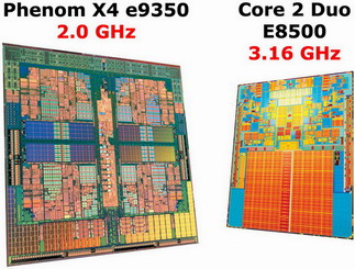 Возьмём наиболее эффективный четырёхъядерный процессор AMD Phenom X4 9350e на 2,0 ГГц и сравнить его с одним из самых быстрых процессоров Intel Core 2 Duo E8500 на частоте 3,16 ГГц.