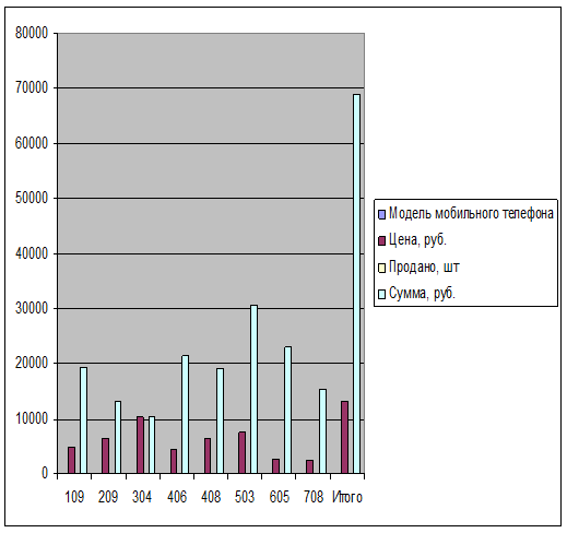 В данной курсовой работе я составила ведомость продажи сотовых телефонов за день, нашла общую сумму выручки от продажи телефонов. Основную долю в сумме выручки составила сумма от продажи 4-х телефонов марки PantechG-670. По количеству лидером продаж является телефон марки SiemensA75. За день телефонов этой марки было продано 8шт.