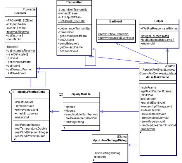 Ім’я головного класу, класу, у якому розташована функція main – ui.MainFrame. Оскільки в ньому є функція main він є головним класом, який запускає програму та є її головним інтерфейсом – викликає інші програмні модулі. Також він відповідає за початкову ініціалізацію параметрів lpt-порта, та запускає окремий поток для зчитування інформації на входах lpt-потра.