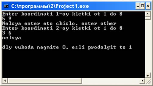 writeln('Enter koordinati 1-oy kletki ot 1 do 8');