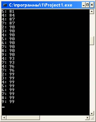 Для написания этой программы воспользуемся функцией sumc (умножение I на любое однозначное число ). Для проверки кратности удобно использовать операцию mod, позволяющую определить остаток при делении целых чисел. Так как числа двузначные, то цикл будет от 10 до 99.