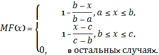 Треугольная функция принадлежности (в соответствии с рисунком 3) определяется тройкой чисел (a, b, c), и ее значение в точке x вычисляется согласно выражению: