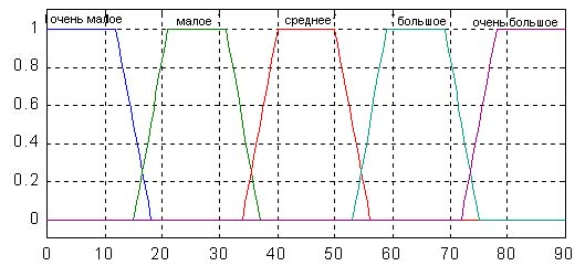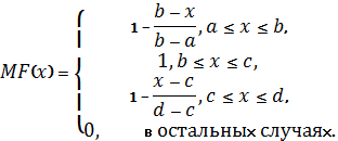 Степень принадлежности четких значений термам задается с помощью функций принадлежности (в нашем случае эти функции имеют форму трапеции).