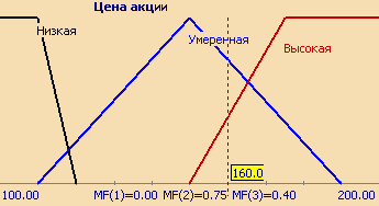 Рассмотрим нечеткое понятие как "Цена акции". Это есть название лингвистической переменной. Сформируем для нее базовое терм-множество, которое будет состоять из трех нечетких переменных: "Низкая", "Умеренная", "Высокая" и зададим область рассуждений в виде X=[100;200] (единиц). Затем построим функцию принадлежности для каждого лингвистического терма из базового терм-множества T.