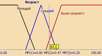 Совокупность функций принадлежности для каждого терма из базового терм-множества T обычно изображаются вместе на одном графике. На рисунке 5 приведен пример описанной выше лингвистической переменной "Цена акции", на рисунке 6 – формализация неточного понятия "Возраст человека". Так, для человека 48 лет степень принадлежности к множеству "Молодой" равна 0, "Средний" – 0,47, "Выше среднего" – 0,20.