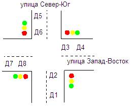 Светофор использует разности показаний четырех пар датчиков: (Д1-Д2), (Д3-Д4), (Д5-Д6) и (Д7-Д8). Таким образом, если для улицы СЮ горит зеленый свет, машины проезжают перекресток и показания двух пар датчиков равны: Д1=Д2, Д5=Д6, а, следовательно, их разность равна нулю. В это же время на улице ЗВ перед светофором останавливаются машины, которые успели проехать только Д4 и Д7. В результате можно рассчитать суммарное количество автомобилей на этой улице следующим образом: