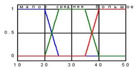 Теперь для каждой переменной надо задать лингвистические термы, соответствующие некоторым диапазонам четких значений. Так, для переменной время зеленого света предлагается использовать три терма (в соответствии с рисунком 10):