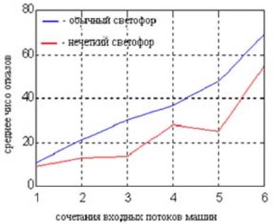 Исследование возможностей светофора с нечеткой логикой, установленного на перекрестке, при различных интенсивностях потоков автомашин и сравнение его работы с обычным светофором.