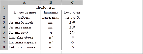 4. На рабочем листе «Услуги» MSExcel создадим таблицу базового прайс-листа.