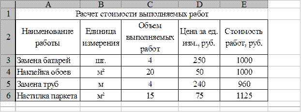 8.3.2. Для расчета стоимости работ по наклейке обоев, замене труб и настилке паркета копируем формулу, введенную в ячейке Е3. Для этого поднесем указатель мыши в правый нижний угол ячейки Е3. Когда указатель примет вид черного крестика, нажав левую кнопку мыши, выделим ячейки Е4, Е5, Е6. В результате будет рассчитана стоимость каждого из видов работ.