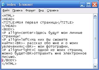 Web-страницу можно написать и в простом текстовом редакторе Блокнот. Для того, чтобы ваш файл воспринимался как Web-страница, его расширение следует переименовать в .htm или .html. Тогда он будет открываться интернет-браузером. Создатели Web-страниц считают Блокнот достаточно удобным средством для создания файлов HTML. Блокнот предоставляет минимальные средства оформления, поэтому здесь исключена вероятность случайного сохранения специальных атрибутов форматирования в текстовых файлах. Это особенно важно иметь в виду при создании документов HTML для Web -страницы, так как присутствие специальных символов или других атрибутов форматирования на опубликованной Web-странице может оказаться нежелательным или даже вызвать ошибки [8].