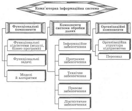 Практично всі розглянуті різновиди інформаційних підсистем КІСП, незалежно від сфери їх застосування, охоплюють однаковий набір компонентів (рис. 2): функціональні компоненти; компоненти системи обробки даних; організаційні компоненти.