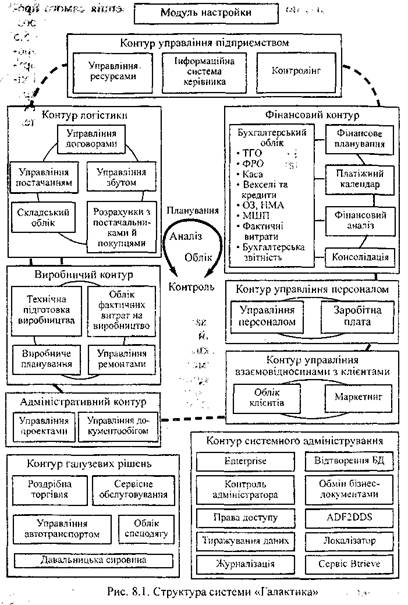 Система «Галактика» орієнтована на автоматизоване розв'язання задач, що виникають на всіх стадіях управлінського циклу: прогнозування, планування, облік і контроль реалізації планів, аналіз результатів діяльності, коригування прогнозів і планів. Система має модульну структуру, модулі, у свою чергу, об'єднані у функціональні контури (див. рис. 1.).