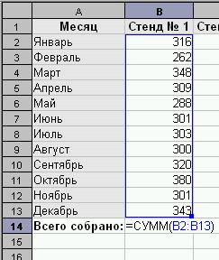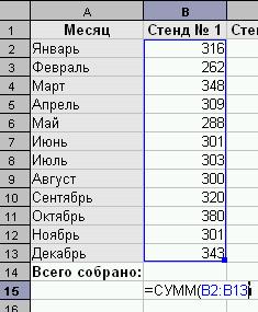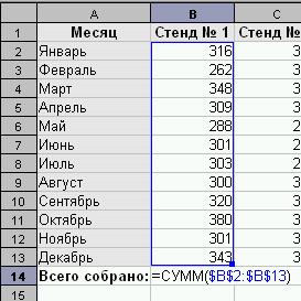 · Скопируем эту формулу в соседнюю ячейку В7. Как видно из рисунка адрес диапазона не изменился, и сумма будет считаться по Стенду № 1.