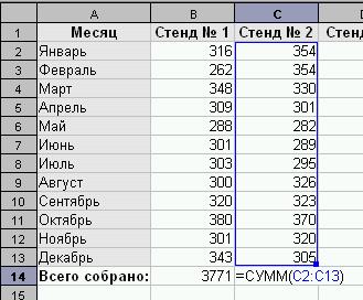 Если же мы скопируем эту формулу в другую ячейку, то в новой формуле будут ссылки на другие ячейки, хотя смысл формулы не изменится. В нашем примере смысл формулы, т.е. подсчет суммы за год не изменился, но формула ссылается теперь на диапазон С2:С13.
