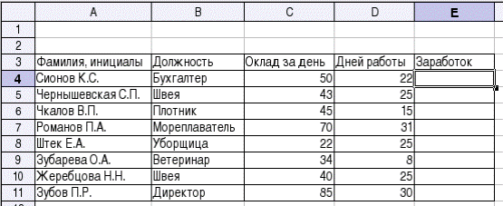 Начнем рассмотрение вычислений в ЭТ с простой задачи. Пусть имеется список из 7 человек, для каждого из которых известны фамилия, инициалы, должность, оклад за день работы и число отработанных дней. Требуется вычислить заработок каждого лица.