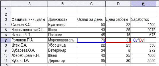 Если в какой-либо ячейке расчетного столбца (столбца "Заработок") перейти в режим редактирования (<F2>), то можно увидеть формулу и выделенные цветом ячейки, содержащие данные для формулы (рис. 3).
