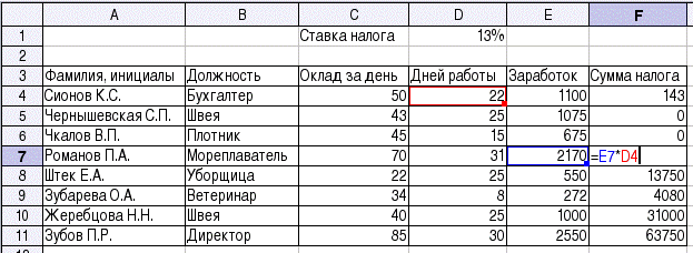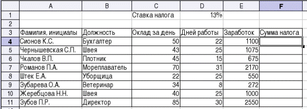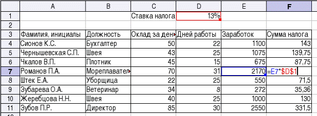 В этом случае использование относительной адресации привело к ошибке – запомнив взаимное расположение ячеек результата и исходных данных (заработка первого в списке и ставки налога) программа ЭТ повторяет это взаимное расположение для остальных строк списка (в чем можно убедиться, войдя в режим редактирования, как показано на рис. 10). Чтобы не создавать дополнительный столбец с одним и тем же значением ставки налога, в соответствующей формуле надо использовать абсолютный адрес ячейки, содержащей параметр (в данном случае – значение ставки налога). Для указания абсолютного адреса к букве столбца или номеру строки добавляется префикс "$" и формула для расчета суммы налога приобретает вид =E4*$D$1 (для добавления символов "$" при редактировании формулы можно использовать комбинацию клавиш <Shift>+<F4>). Отредактировав формулу в ячейке F4, копируем ее снова в оставшиеся ячейки и получаем правильный результат (рис. 11).