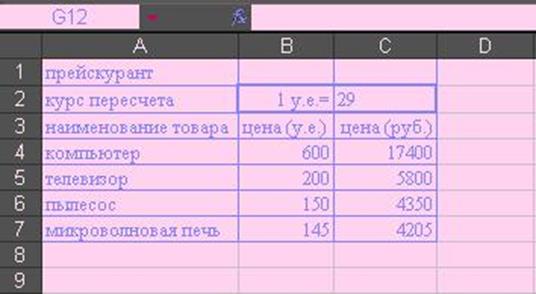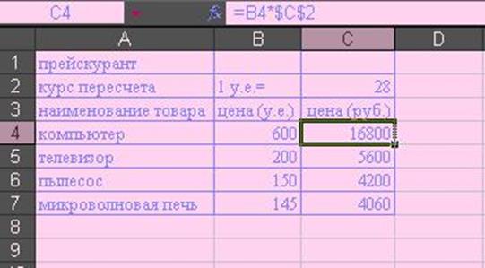В ячейку С4 введем формулу :=И4*$C$2 (набором символа $ с клавиатуры или нажатием клавиши [F4], которая используется для пересчета цены из условным единиц в рубли.