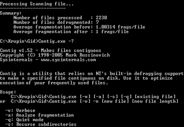 Итак, Contig - утилита командной строки для дефрагментации одиночных файлов (при этом она будет не прочь поработать и с отдельным диском или директорией).