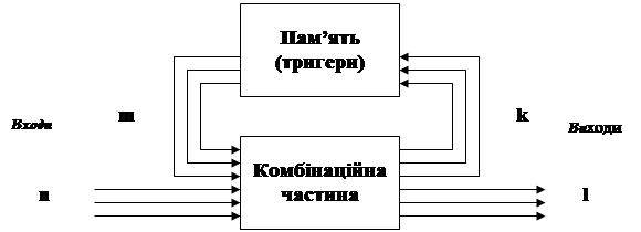 5. Мінімізація функцій збудження тригерів. Функції збудження тригерів реалізовуються комбінаційною частиною автомата, що в загальному випадку має n + m входів (n – кількість вхідних сигналів ЦА, m – кількість виходів всіх тригерів ЦА) та l + k виходів (l – кількість вихідних сигналів ЦА, k – кількість входів всіх тригерів ЦА). Це пояснюється узагальненою структурною схемою послідовнісного ЦА, що зображена на рис.1. Тобто, на цьому етапі виконується спільна мінімізація l + k логічних функцій n + m аргументів. Для мінімізації функцій використовуються будь-які існуючі методи – наприклад, карти Карно.