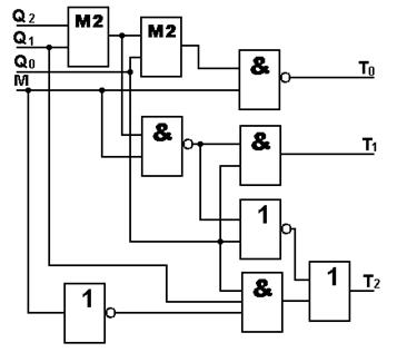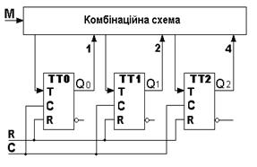Комбінаційна схема реалізує необхідні функції збудження Т -тригерів на основі їх станів та керуючого сигналу М . Всі тригери мають загальні входи скидання та синхронізації.