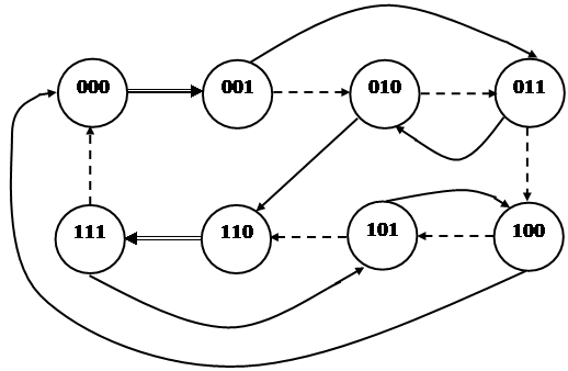 На підставі табл. 1 складемо граф переходів (діаграму станів) лічильника, що показана на рис. 3. Напрямки переходів на діаграмі вказані: для рахування в коді 8421 – пунктирними лініями, для рахування в коді Грея – суцільними лініями. Ділянки діаграми, де напрямки переходів у двох режимах співпадають, вказані подвійними лініями.